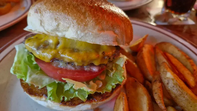 육즙 가득한 패티와 신선한 채소가 듬뿍 들어간 치즈 버거의 압도적인 비주얼.