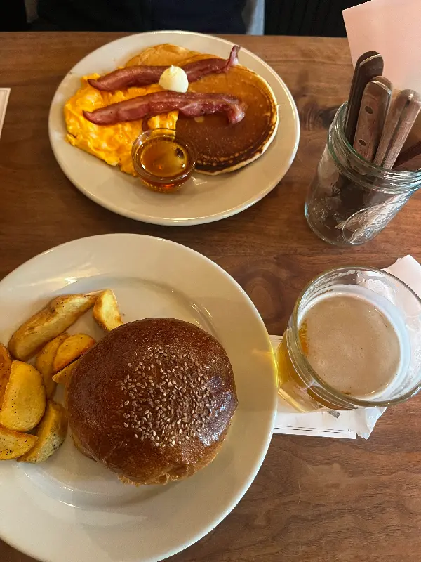 고민 끝에 가장 기본인 햄버거와 베이컨 에그 팬케이크를 주문했습니다. 잠시 후, 테이블 위에 놓인 버거의 웅장한 모습에 감탄했습니다. 윤기가 흐르는 부드러운 빵, 두툼한 패티, 신선한 채소들이 층층이 쌓여 있었죠. 마치 예술 작품을 보는 듯한 황홀경에 빠졌습니다.