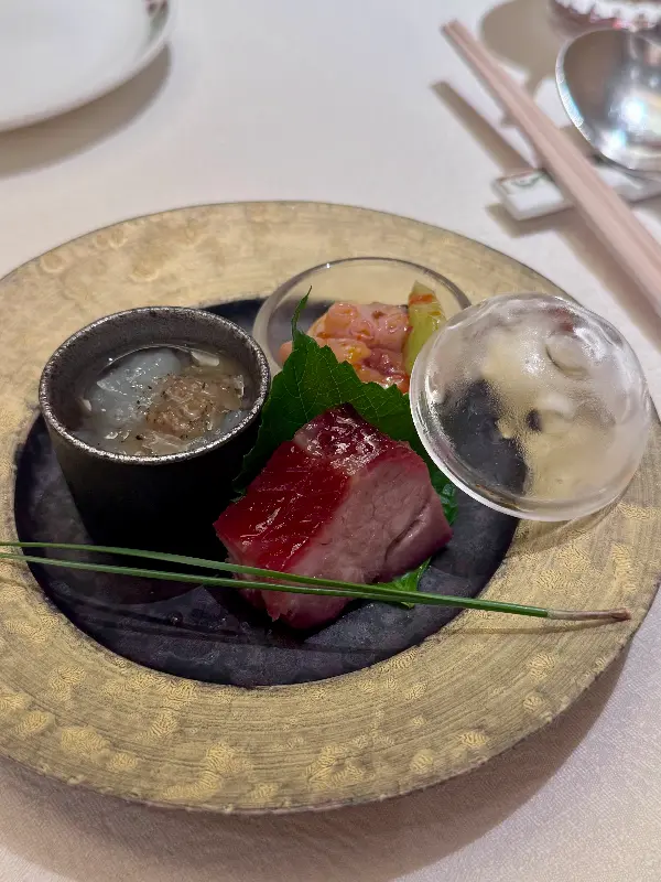 고민 끝에 선택한 코스 메뉴는 다채로운 중식의 매력을 한껏 느낄 수 있는 훌륭한 선택이었습니다. 세 가지 종류의 전채 요리가 먼저 나왔습니다. 윤기가 흐르는 붉은 빛깔의 돼지고기, 톡톡 터지는 식감이 즐거운 해파리 냉채, 그리고 입 안을 상쾌하게 해주는 오이 샐러드가 입맛을 돋우었습니다.