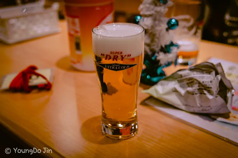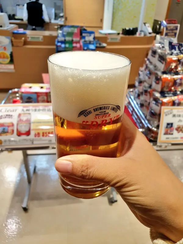 견학 후, 25분 동안 진행되는 시음 시간은 아사히 맥주 공장 견학의 하이라이트입니다. 1인당 3잔까지 갓 생산된 신선한 생맥주를 무료로 맛볼 수 있습니다. 아사히 프리미엄, 아사히 엑스트라 콜드(일반 맥주와 흑맥주) 등 다양한 종류의 맥주가 준비되어 있어 취향에 따라 선택할 수 있습니다. 특히 한국에서 판매되지 않는 아사히 프리미엄은 꼭 맛봐야 할 맥주입니다. 맥주를 못 마시는 분들을 위해 아사히에서 만든 음료수도 준비되어 있으며, 음료수는 무제한으로 마실 수 있습니다. 시음 테이블에는 인원수에 맞춰 쌀과자 안주도 준비되어 있습니다.
