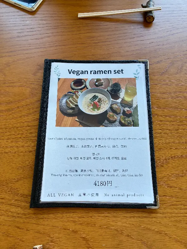 깔끔하게 정리된 메뉴판에는 비건 라멘 세트 메뉴가 소개되어 있습니다. 사진만 봐도 군침이 도네요.