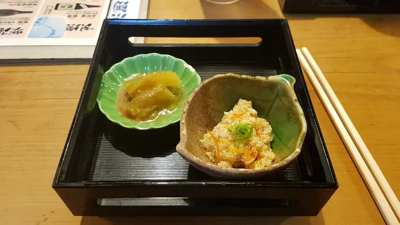 런치 메뉴의 가격은 정말 놀라웠습니다. 특히 휴일 1000엔(평일 850엔)에 즐길 수 있는 모듬 초밥은 가성비의 끝판왕이라고 해도 과언이 아니었죠. 엔저 현상까지 더해져 한국에서 상상하기 힘든 가격으로 훌륭한 퀄리티의 스시를 맛볼 수 있다는 사실에 감탄했습니다. 런치 세트를 주문하자, 따뜻한 미소시루와 곁들임 메뉴가 먼저 나왔습니다.