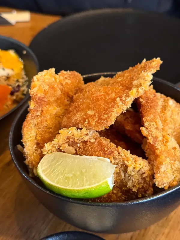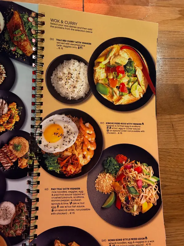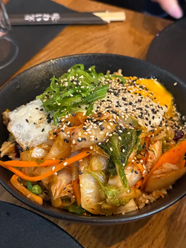 솔직히 가격은 조금 부담스러웠습니다. 김치볶음밥이 한국 돈으로 약 27,000원, 삼겹살 덮밥은 약 40,000원 정도였으니, 저렴한 가격은 아니었습니다. 하지만 음식이 나오는 것을 보니, 푸짐하게 들어간 재료들을 보고 어느 정도 납득할 수 있었습니다. 아낌없이 사용된 신선한 채소와 해산물은 가격에 대한 아쉬움을 조금이나마 달래주었습니다.