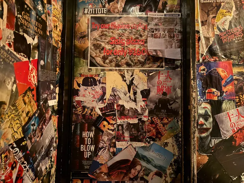벽면에는 오래된 영화 포스터와 광고 전단지들이 빼곡하게 붙어 있어 독특한 분위기를 자아냅니다. 마치 시간 여행을 떠나온 듯한 느낌을 주죠. 붉은색과 초록색 조명이 번갈아 비추는 내부는 클럽과 같은 활기 넘치는 분위기를 더합니다.