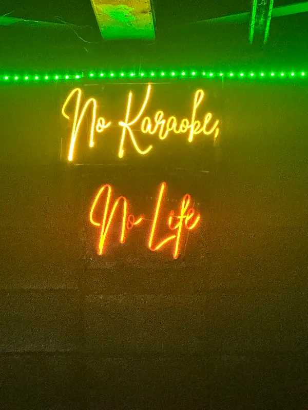 “No Karaoke, No Life” 네온사인은 바코드의 활기찬 분위기를 대변합니다.