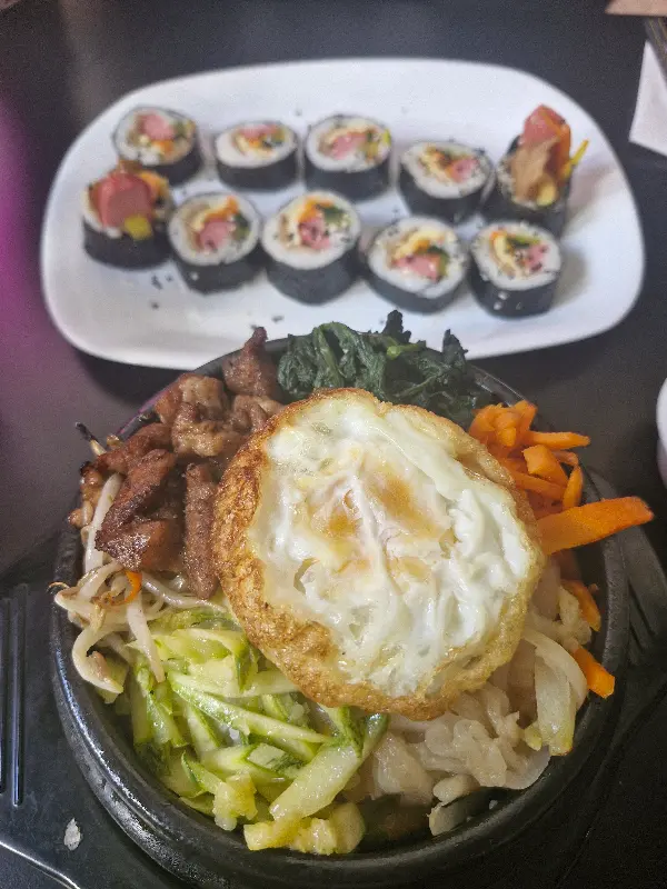 다른 테이블에서는 김치 치킨까스, 비빔밥, 김밥 등 다양한 한국 음식을 즐기는 사람들의 모습이 보입니다. 특히 비빔밥은 신선한 채소와 고기, 그리고 계란이 조화롭게 어우러져, 보는 것만으로도 군침이 돌게 합니다.