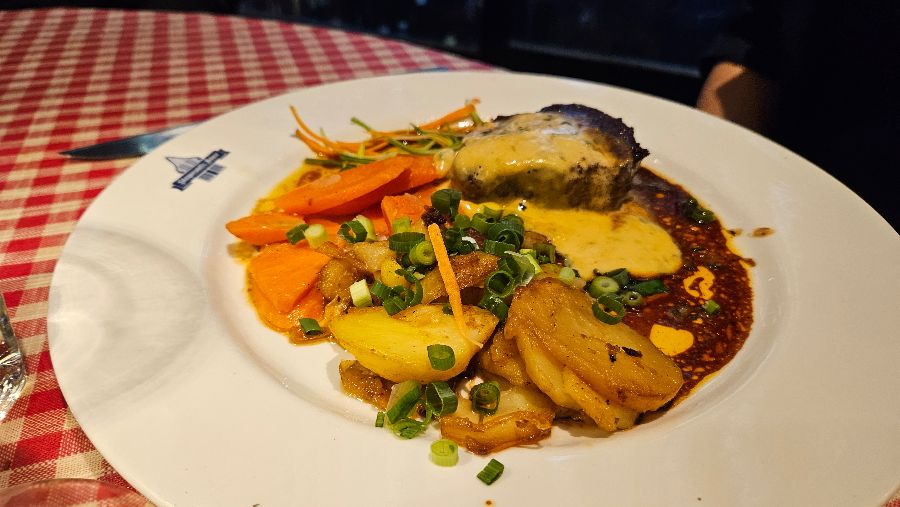 메뉴판을 펼쳐보면 다양한 독일 전통 음식들이 눈길을 사로잡는다. 메인 요리로는 Sauerbraten (독일식 사워 브레이즈), Wiener Schnitzel (비너 슈니첼), Kassler Rippchen (캐슬러 립쉔) 등이 있으며, 소시지 종류도 다양하게 준비되어 있다. 디저트로는 Homemade Apple Strudel (홈메이드 애플 슈트루델)과 Swiss Chocolate Mousse (스위스 초콜릿 무스)가 인기 있다. 특히 겉은 바삭하고 속은 촉촉한 애플 슈트루델은 따뜻한 커스터드 소스와 함께 제공되어 달콤한 마무리를 선사한다.
