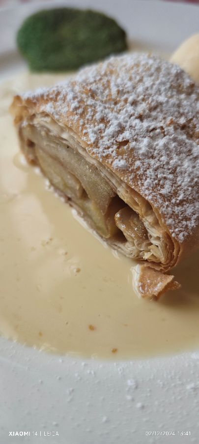 겉은 바삭하고 속은 촉촉한 홈메이드 애플 슈트루델은 달콤한 커스터드 소스와 완벽한 조화를 이룬다.
