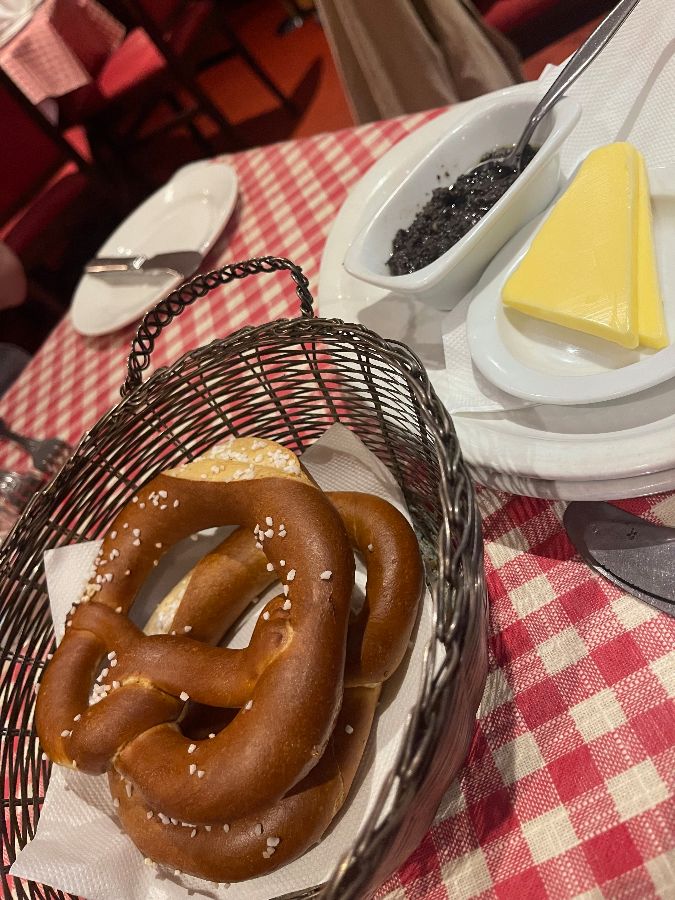따뜻하게 제공되는 프레첼과 버터는 루디 레스토랑의 따뜻한 환대를 상징한다.