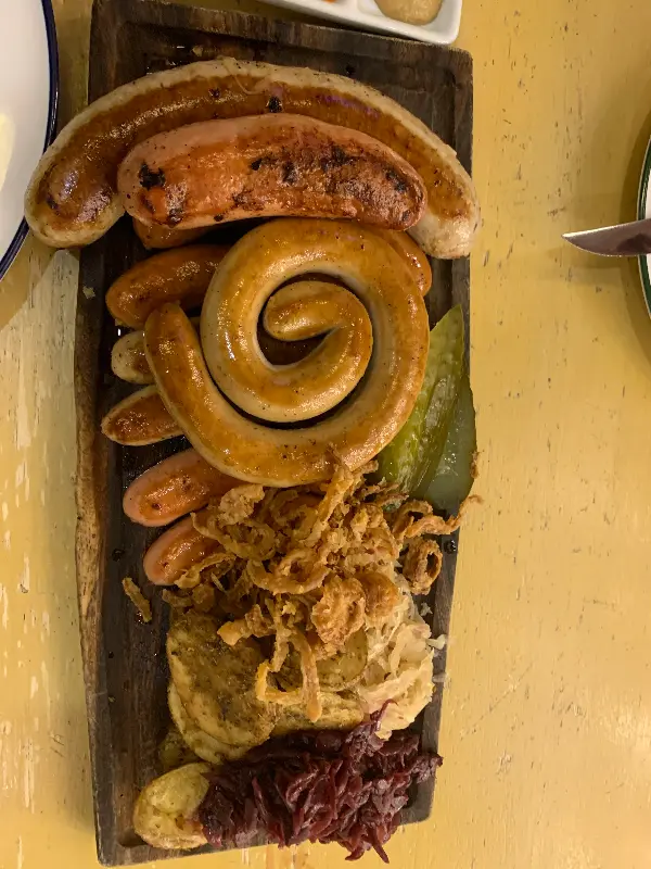 우리는 브로zeit의 대표 메뉴인 소시지 모듬과 학센, 그리고 추천받은 맥주를 주문했다. 잠시 후, 테이블 위로 푸짐한 음식들이 차려졌다. 먹음직스러운 비주얼에 감탄하며 사진을 찍는 것은 당연한 순서였다.