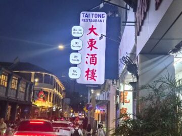 밤이 찾아온 페낭 거리, ‘Tai Tong Restaurant’의 간판이 환하게 빛나며 방문객들을 맞이합니다. 저녁 장사를 시작하며 활기를 띠는…