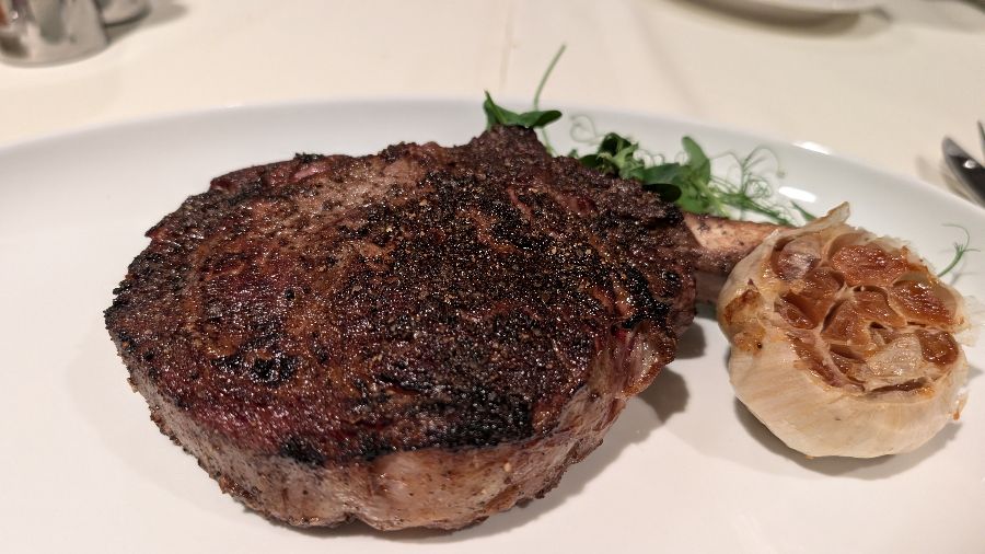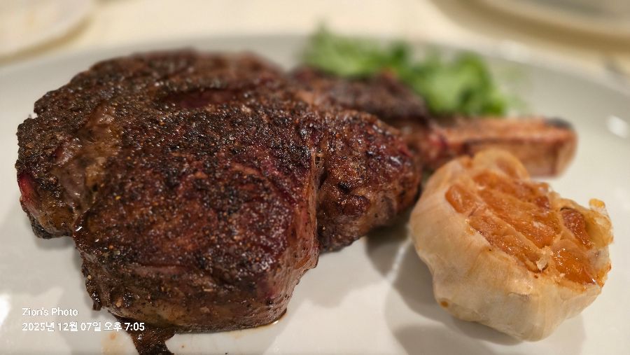스테이크 옆에는 통마늘 구이와 신선한 채소가 곁들여져 맛의 균형을 더합니다. 마늘의 은은한 단맛과 향은 스테이크의 풍미를 더욱 깊게 만들어주며, 함께 제공되는 소스는 고기의 맛을 더욱 다채롭게 즐길 수 있게 합니다. 이곳의 스테이크는 어떤 미식가도 만족시킬 만한 최상급의 맛과 품질을 자랑합니다.