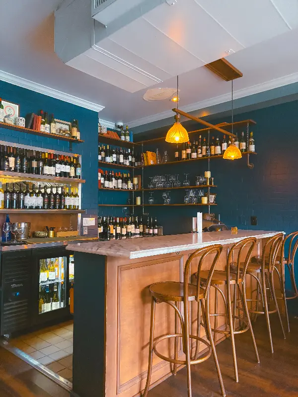 다양한 와인들이 진열된 바 테이블과 은은한 조명이 아늑한 분위기를 연출합니다.