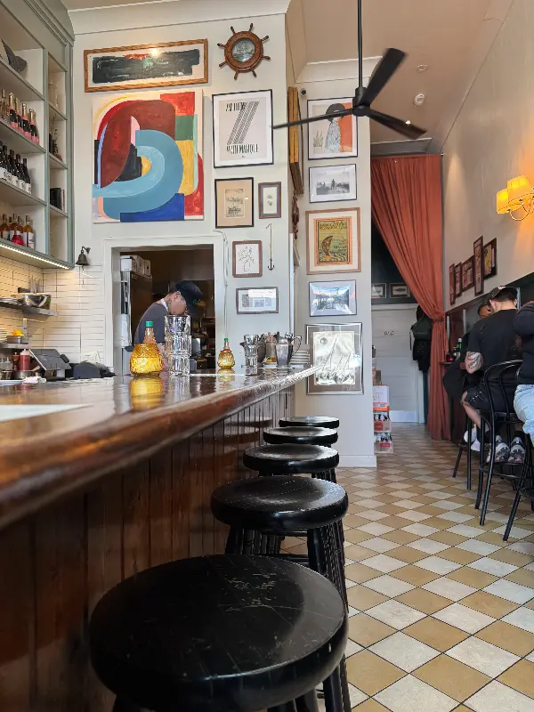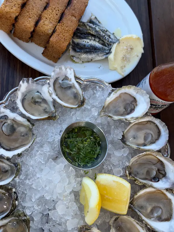 문을 열고 들어서는 순간, 활기 넘치는 분위기와 함께 독특한 인테리어가 눈길을 사로잡았습니다. 아담한 공간이지만, 야외 테라스 좌석과 높은 테이블, 바 좌석이 조화롭게 배치되어 있었습니다. 동부 해안의 매력과 런던 스타일의 분위기가 어우러진 듯한 느낌이었어요. 특히, 바 테이블에 앉아 굴 전문가가 굴 껍질을 까는 모습을 직접 볼 수 있다는 점이 무척 인상적이었습니다. 마치 연극의 한 장면을 보는 듯한 생생함이 느껴졌습니다.