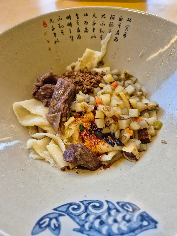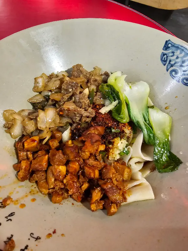 주문 후 얼마 지나지 않아, 테이블 위로 김이 모락모락 피어오르는 요우파우면이 놓였다. 붉은 기름이 감도는 국물 위로 쫄깃해 보이는 면발과 신선한 채소가 조화롭게 어우러져 있었다. 사진(Image 1)에서 보듯이, 면발은 굵고 넓적하며, 그 위에는 고추기름과 각종 양념이 듬뿍 뿌려져 있어 보기만 해도 군침이 돌았다.
