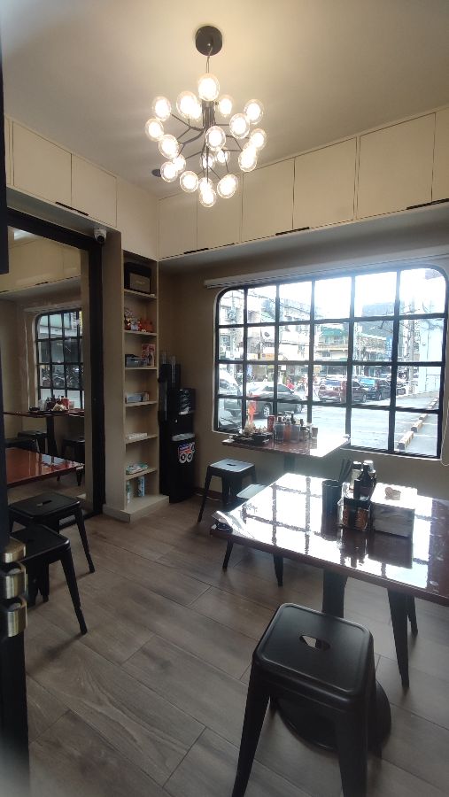 문을 열고 들어서는 순간, 바깥의 번잡함은 신기루처럼 사라지고, 차분하고 쾌적한 실내 공간이 펼쳐졌습니다. 에어컨이 시원하게 작동하는 이 공간은, 뜨거운 필리핀의 날씨 속에서 한 줄기 오아시스 같았습니다. 나뭇결이 살아있는 밝은 우드 톤 바닥은 따뜻한 느낌을 주었고, 천장의 유니크한 디자인 샹들리에는 공간에 현대적이면서도 아늑한 빛을 더했습니다. 검은색 금속 스툴과 심플한 테이블이 조화롭게 배치되어 있었는데, 최대 10명 정도가 동시에 앉아 식사를 즐길 수 있는 아담하면서도 효율적인 공간 활용이 돋보였습니다. 창밖으로는 도시의 풍경이 액자처럼 들어와, 식사하는 동안에도 답답함 없이 개방감을 느낄 수 있었습니다.