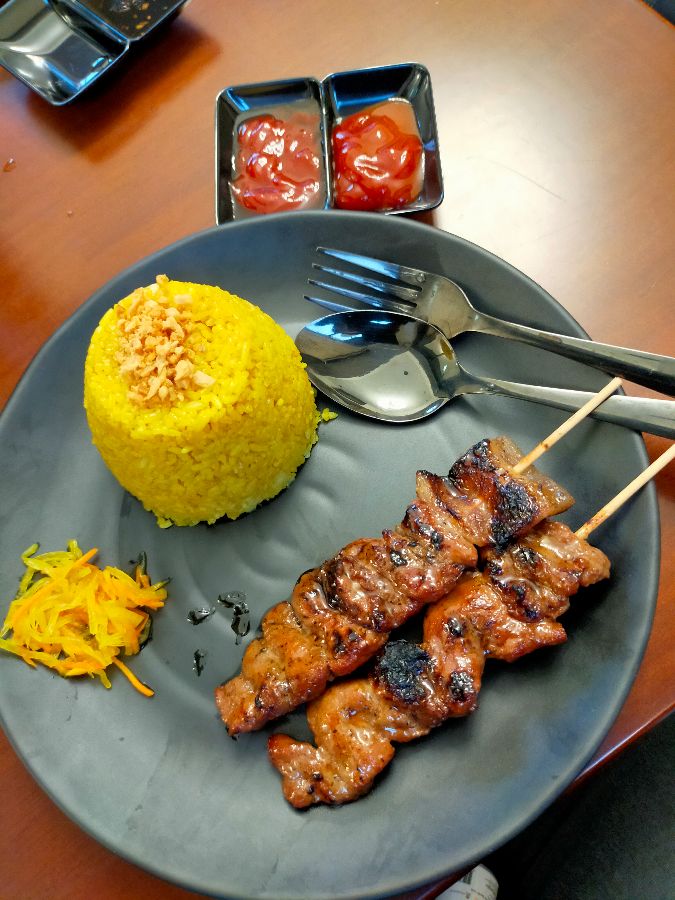 드디어 주문한 음식이 테이블에 올랐습니다. 검은색 접시 위에 먹음직스럽게 담겨 나온 돼지고기 바비큐 두 꼬치는 보는 것만으로도 군침이 돌게 했습니다. 불에 잘 그슬린 듯한 양념은 강렬한 불맛을 예고했고, 윤기가 흐르는 고기는 육즙 가득한 부드러움을 암시했습니다. 특히, 밥 위에 뿌려진 튀긴 마늘 플레이크는 고소한 향을 더하며 식욕을 돋우었습니다. 옆에 놓인 자바 라이스의 선명한 노란색은 바비큐의 진한 색감과 아름다운 대비를 이루었고, 아차라(절인 파파야)는 느끼함을 잡아줄 완벽한 조연 역할을 했습니다. 작은 그릇에 담긴 두 가지 소스는 취향에 따라 바비큐의 풍미를 더욱 다채롭게 즐길 수 있게 해주었습니다.