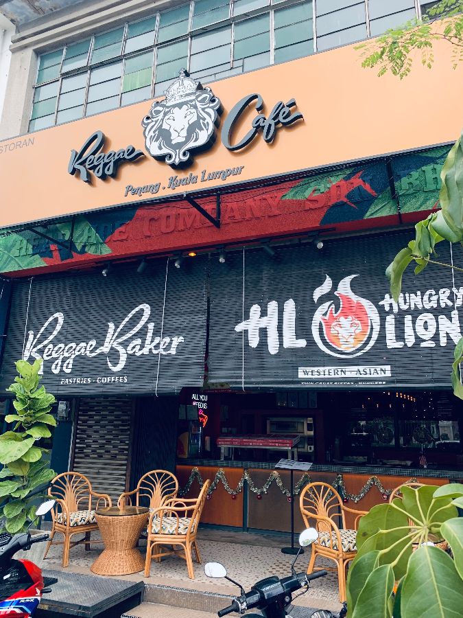 레게 카페의 매력적인 외부 전경. ‘Reggae Baker’와 ‘Hungry Lion’이라는 이름이 인상적이다.