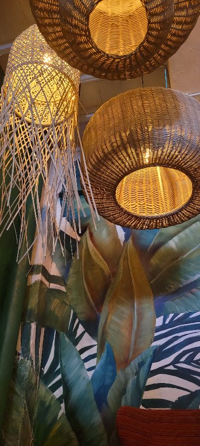 라탄 조명과 열대 식물 벽화가 어우러진 내부 인테리어는 이국적인 매력을 더한다.