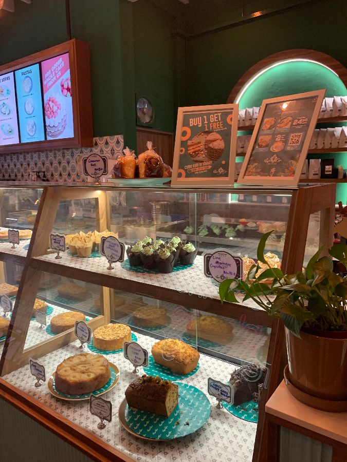 카페 내부는 짙은 녹색과 원목의 조화로 안정감을 주며, 다양한 종류의 베이커리와 디저트가 진열된 쇼케이스는 보는 즐거움을 더합니다. 갓 구운 빵과 화려한 케이크들이 유리 진열장 안에 가지런히 놓여 있어, 마치 작은 보석 상자를 들여다보는 듯한 설렘을 안겨줍니다. “케이크 종류도 정말 다양해서 고르는 재미가 쏠쏠해요!”라는 방문객의 평처럼, 이곳은 선택의 폭이 넓어 미식의 즐거움을 더합니다.