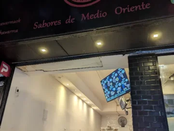 골목길을 따라 걷다 보면, 붉은색 간판이 눈에 띄는 작은 가게, 돈 샤와르마가 나타납니다. 간판에는 “Sabores de Medio…